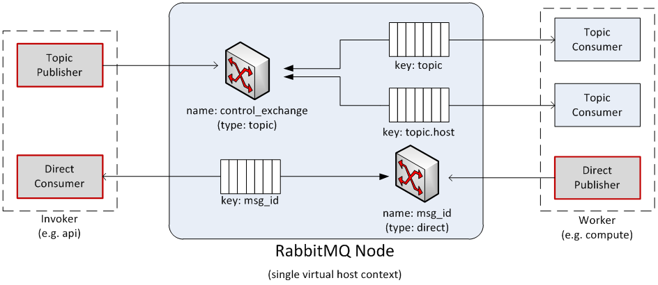 2. once the message is dispatched by the exchange, it is fetched by the Topic Consumer dictated by the routing key (such as ‘topic.host’) and passed to the Worker in charge of the task.