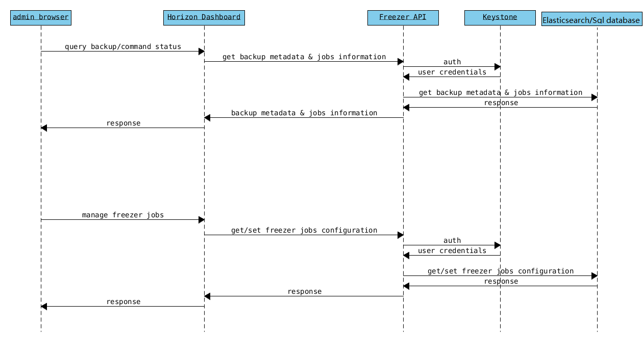 The API is used to store and provide metadata to the Freezer Web UI and to the Freezer Scheduler. Also the API is used to store session information for multi node backup synchronization. No workload data is stored in the API. For more information to the API please refer to: freezer_api/README.rst |