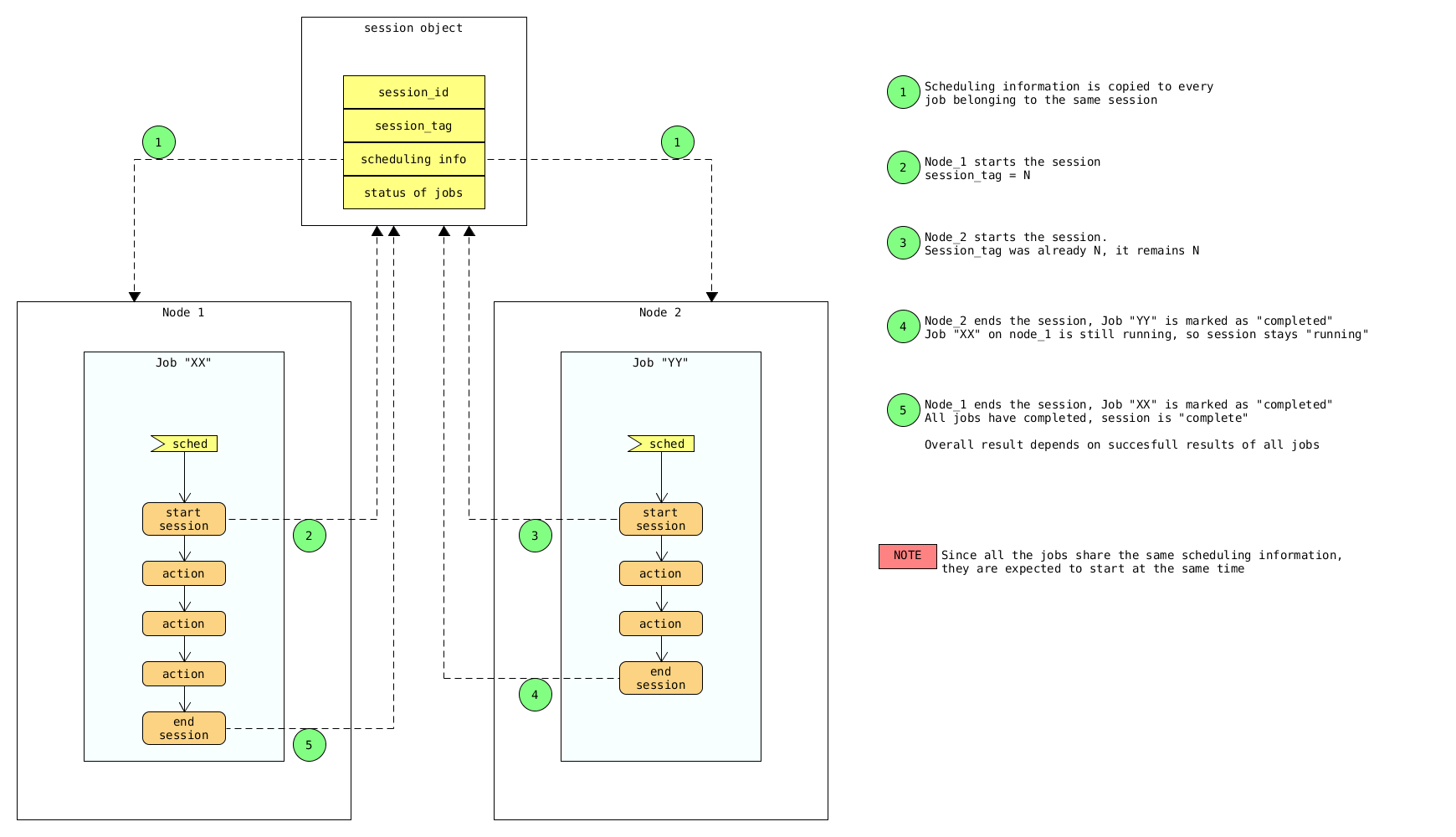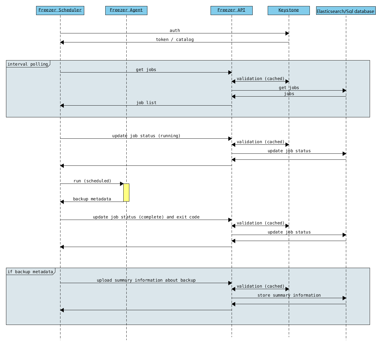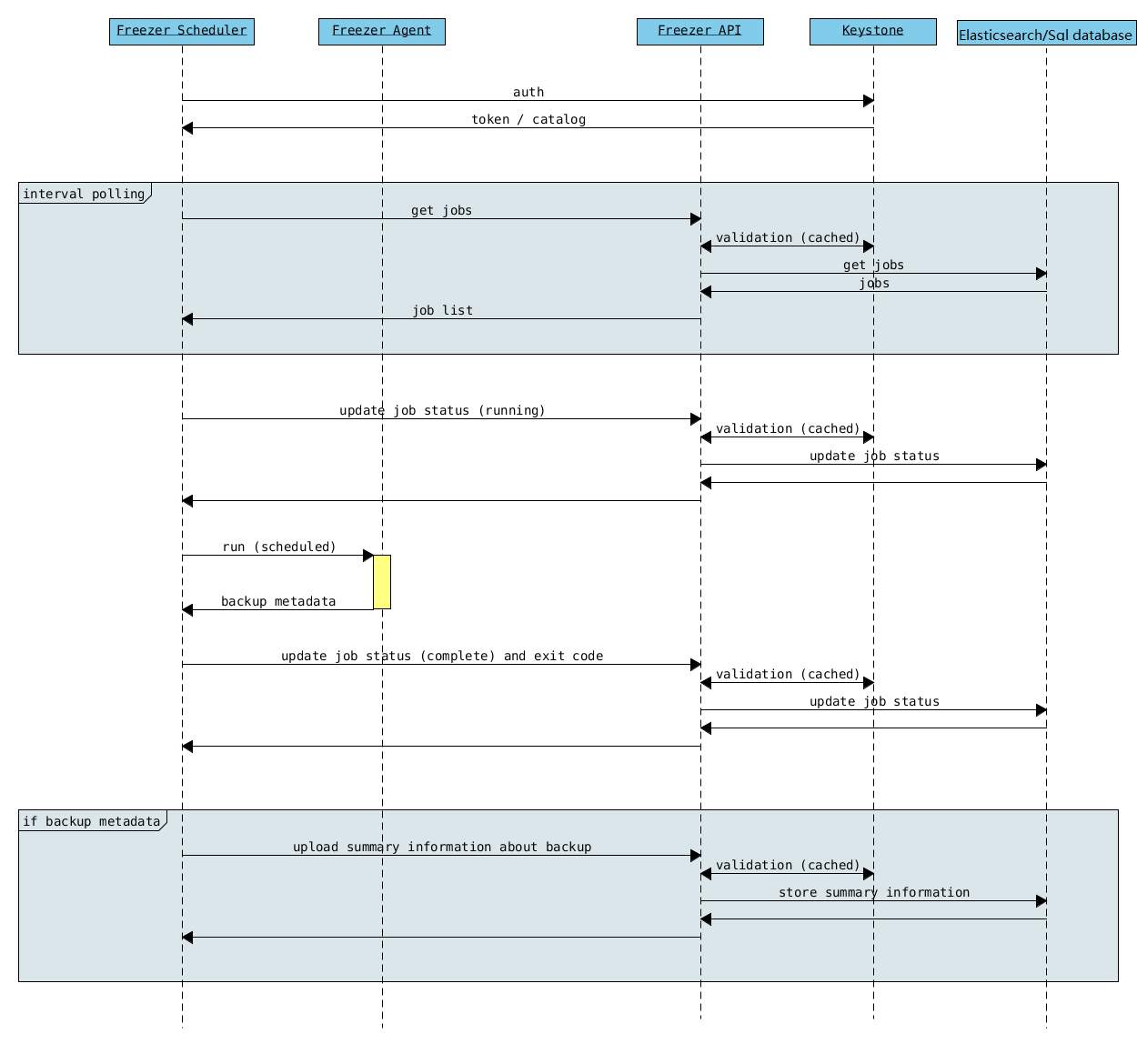 A client side component, running on the node where the data backup is to be executed. It consists of a daemon that retrieves the data from the freezer API and executes jobs (i.e. backups, restore, admin actions, info actions, pre and/or post job scripts) by running the Freezer Agent. The metrics and exit codes returned by the freezer agent are captured and sent to the Freezer API. The scheduler manages the execution and synchronization of multiple jobs executed on a single or multiple nodes. The status of the execution of all the nodes is saved through the API. The Freezer scheduler takes care of uploading jobs to the API by reading job files on the file system. It also has its own configuration file where job session or other settings like the freezer API polling interval can be configured. The Freezer scheduler manages jobs, for more information about jobs please refer to: freezer_api/README.rst under JOB the sections |