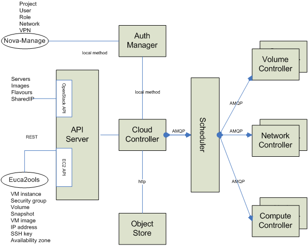 Manila uses direct, fanout, and topic-based exchanges. The architecture looks like the one depicted in the figure below: