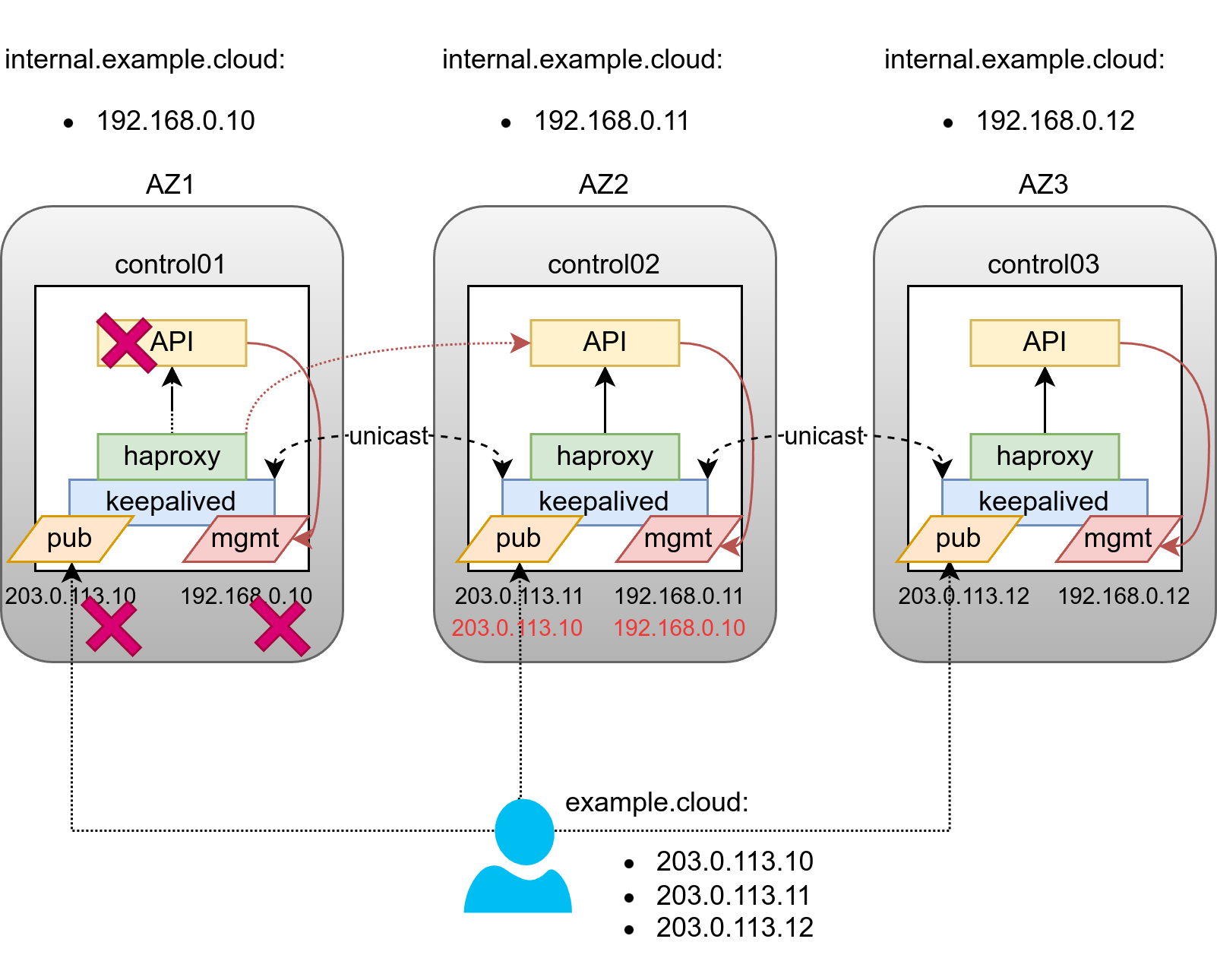 A Load Balancer (HAProxy) is usually deployed on infrastructure hosts. With infrastructure hosts being spread across Availability Zones we need to come up with a more complex design which is aimed at solving the following issues: