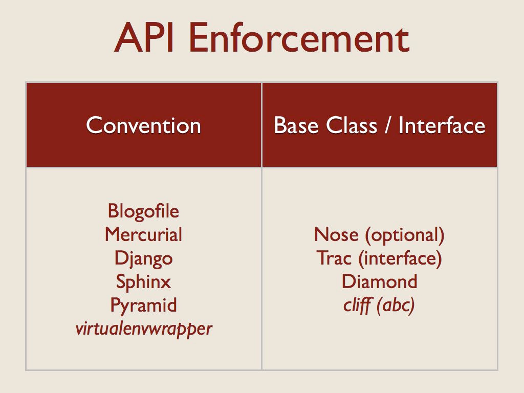 One common issue with dynamically loaded code is enforcing the plugin API at runtime. This is always a potential issue in dynamic languages, but it comes up frequently with plugins because the code is often written by someone other than the core developer for the application. I saw two basic techniques to help developers get their plugins right: convention and interfaces.