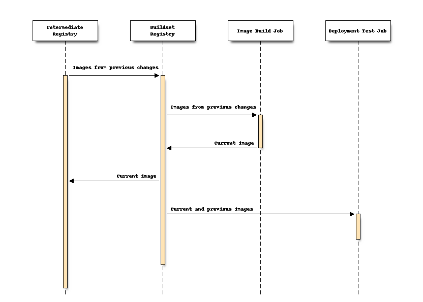 The intermediate registry is always running and the buildset registry is started by a job running on a change. The “Image Build” and “Deployment Test” jobs are example jobs which might be running on a change. Essentially, these are image producer or consumer jobs respectively.